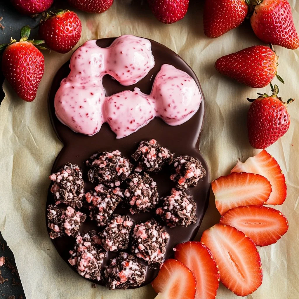 Delightful chocolate-covered yogurt clusters filled with fresh strawberries, perfect for a sweet yet healthy snack.