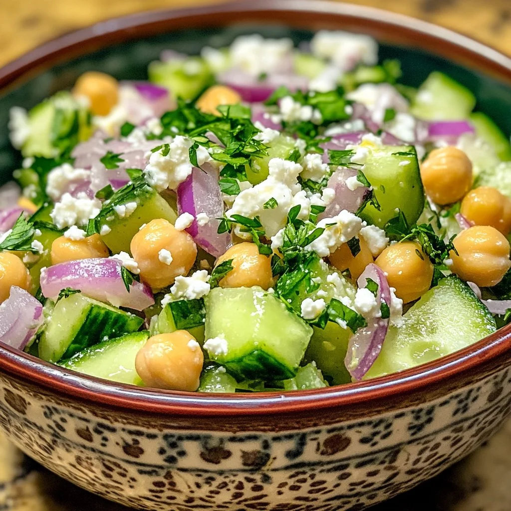 Start by rinsing the chickpeas thoroughly to remove excess sodium. You want them fresh and ready to soak up all the flavors. Next, chop the cucumber, slice the cherry tomatoes in half, and finely chop the red onion for that perfect bite. Ensure each ingredient is prepared before assembling the salad for a smooth cooking experience.
