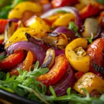 A vibrant and flavorful roasted vegetable salad featuring mixed bell peppers, zucchini, red onion, and cherry tomatoes, enhanced by balsamic vinegar and fresh herbs.
