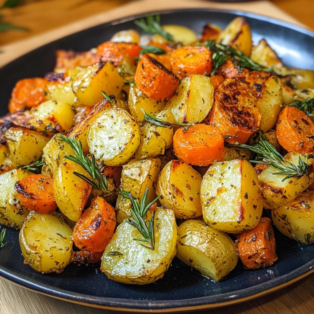 A delightful medley of baby potatoes, carrots, and zucchini roasted with garlic and fresh herbs, perfect as a side or light main course.