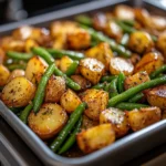 A colorful and nutritious side dish featuring garlic roasted potatoes and green beans, perfect for family gatherings.