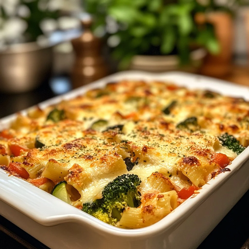 A delightful pasta bake featuring fresh Mediterranean vegetables and feta cheese, perfect for family dinners or gatherings.