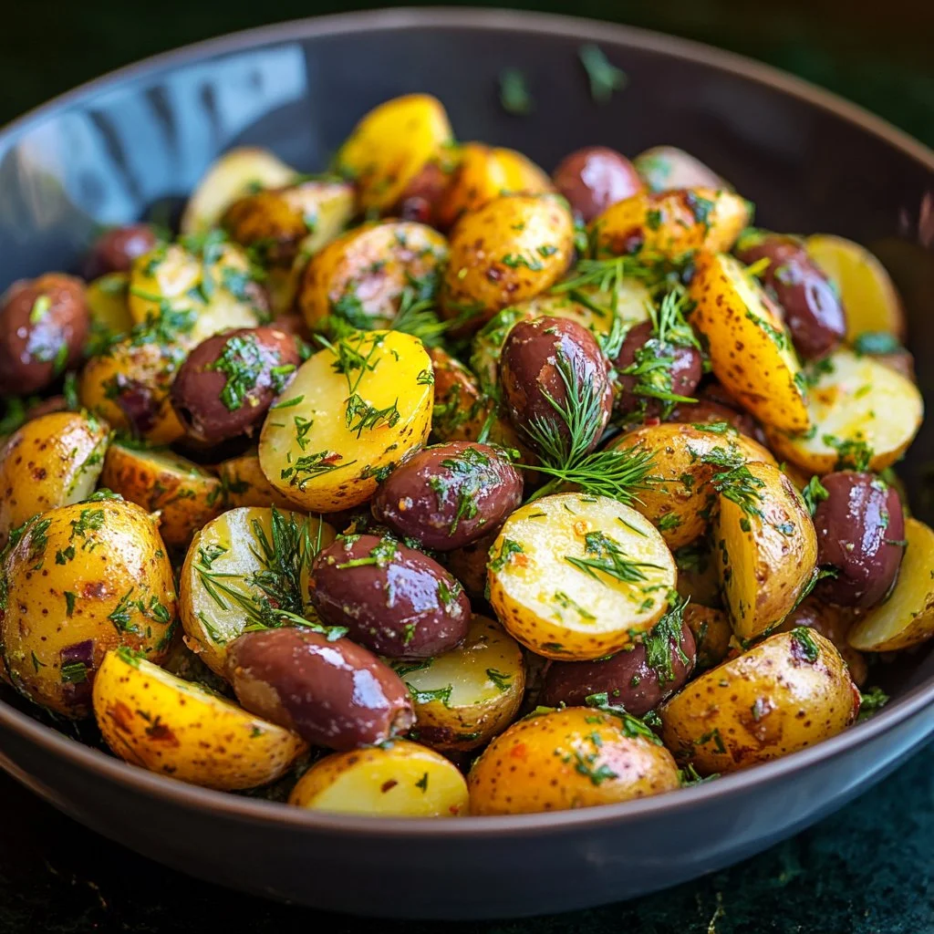 A vibrant and refreshing salad featuring tender baby potatoes, cherry tomatoes, cucumbers, and Kalamata olives, all drizzled with a zesty olive oil dressing.
