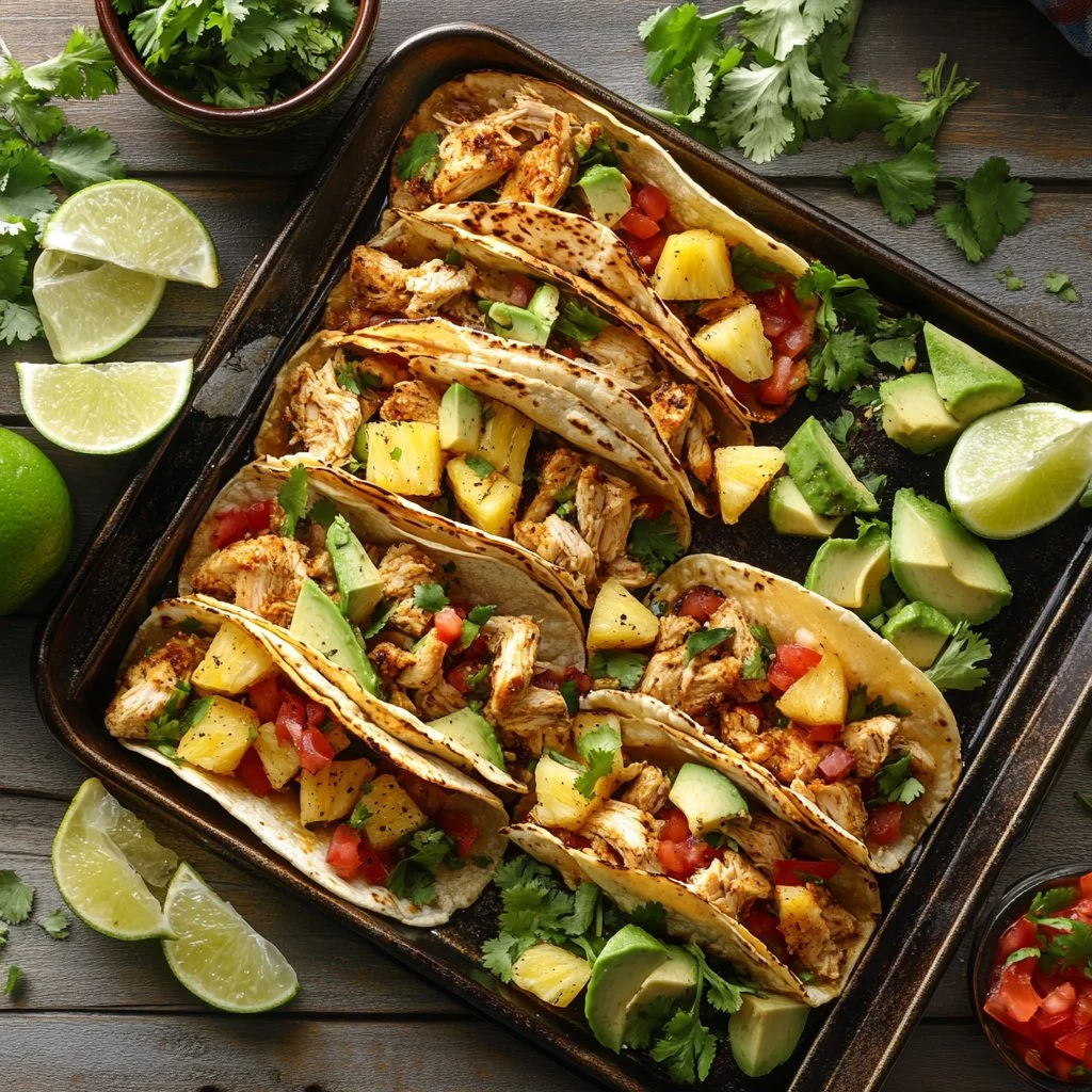 Delicious tacos filled with tender marinated chicken and sweet, caramelized pineapple, perfect for family dinners.