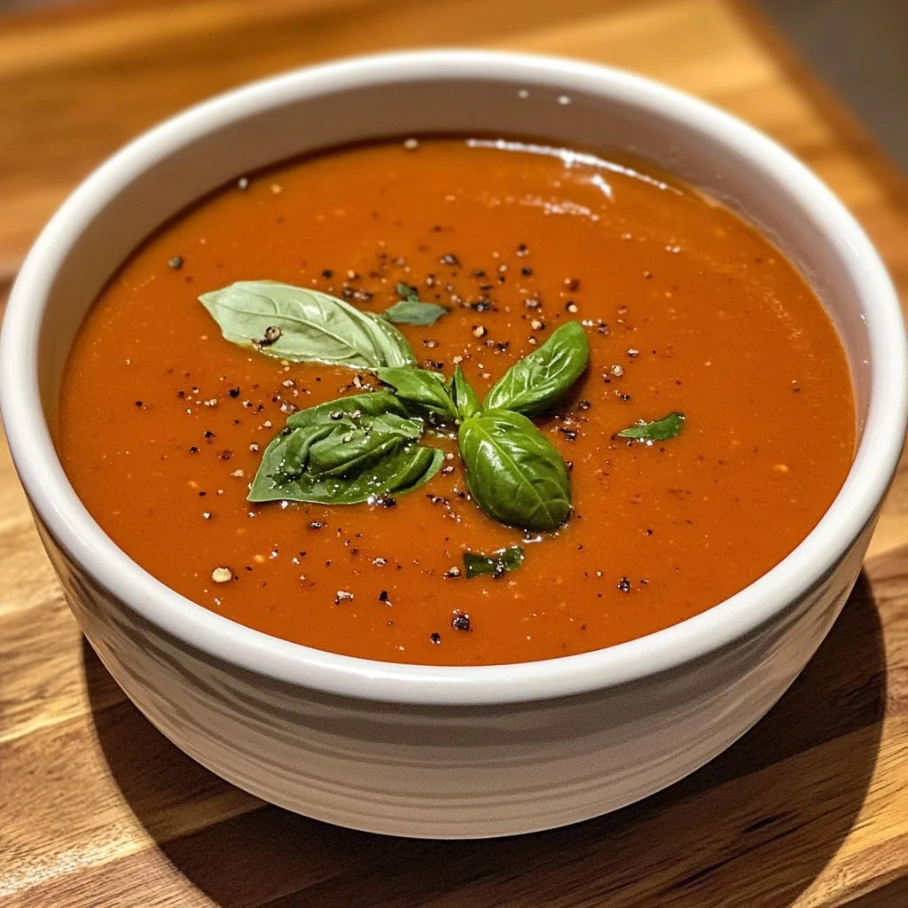 A comforting roasted tomato basil soup with earthy flavors, perfect for cozy gatherings.