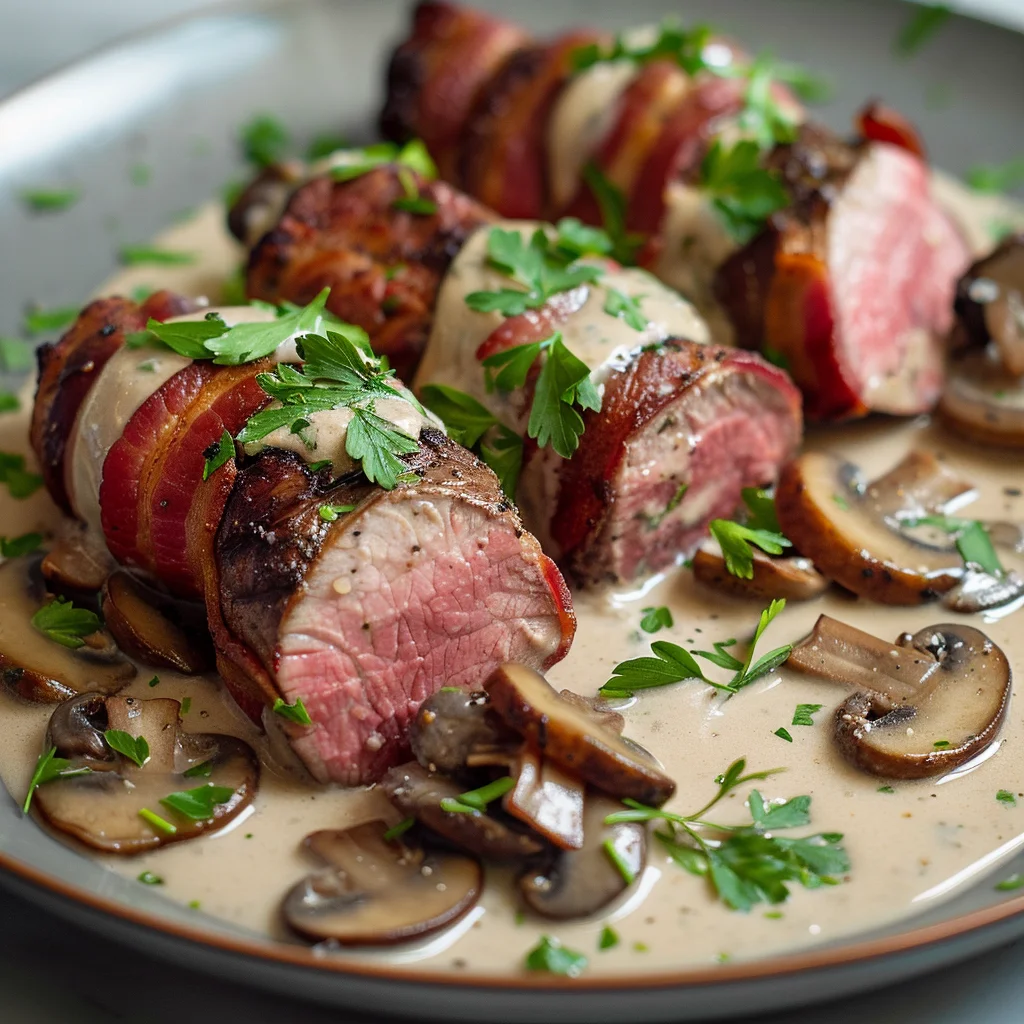 Bacon Wrapped Venison Backstrap: Luxurious Mushroom Cream Sauce